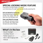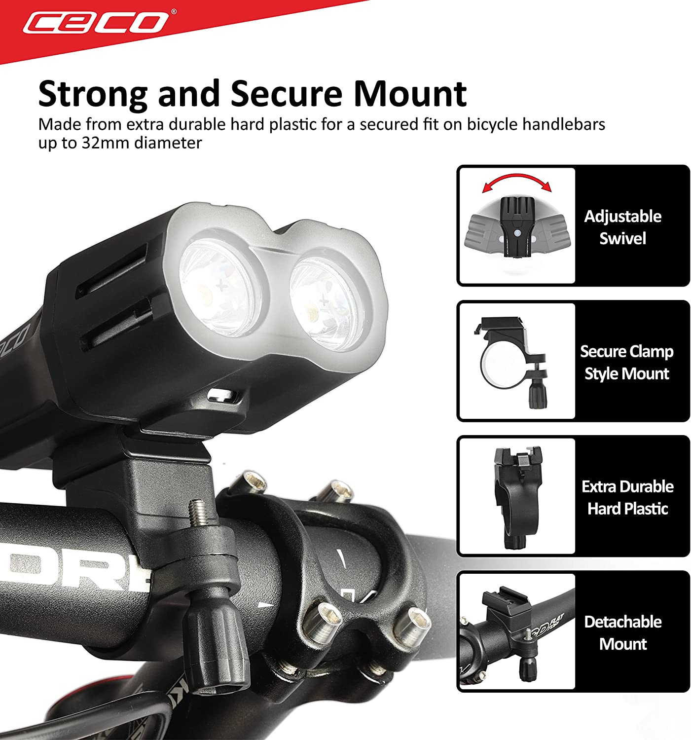• SECURE AND EASY MOUNTING – Strong and secure Zytel hard plastic material based mount attaches fast and easily on handlebars up to 32mm diameter. It swivels left and right to aim the light where needed and uses a quick release function to separate the light from the mount for use as a flashlight or when not in use.